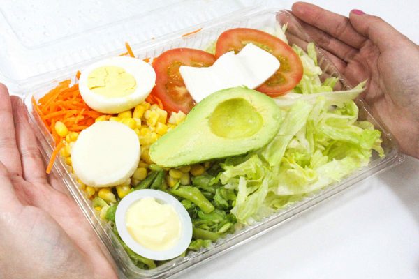Pechuga de pollo laminada, lechuga, choclo, tomate, quesillo, huevo, poroto verde, palmito, zanahoria, palta, mayonesa + pocillo con Arroz