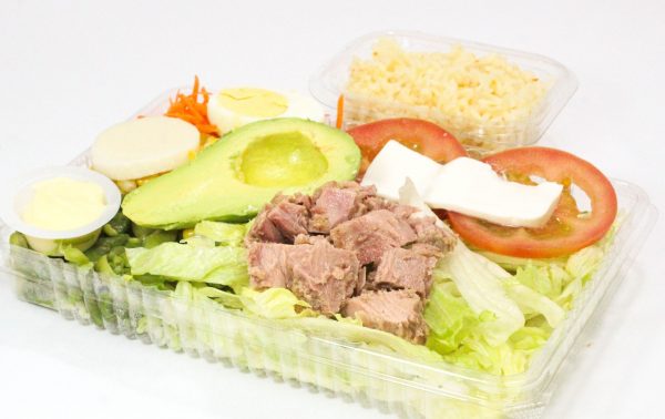 Atún, lechuga, choclo, tomate, quesillo, huevo, poroto verde, palmito, zanahoria, palta, mayonesa + pocillo con Arroz